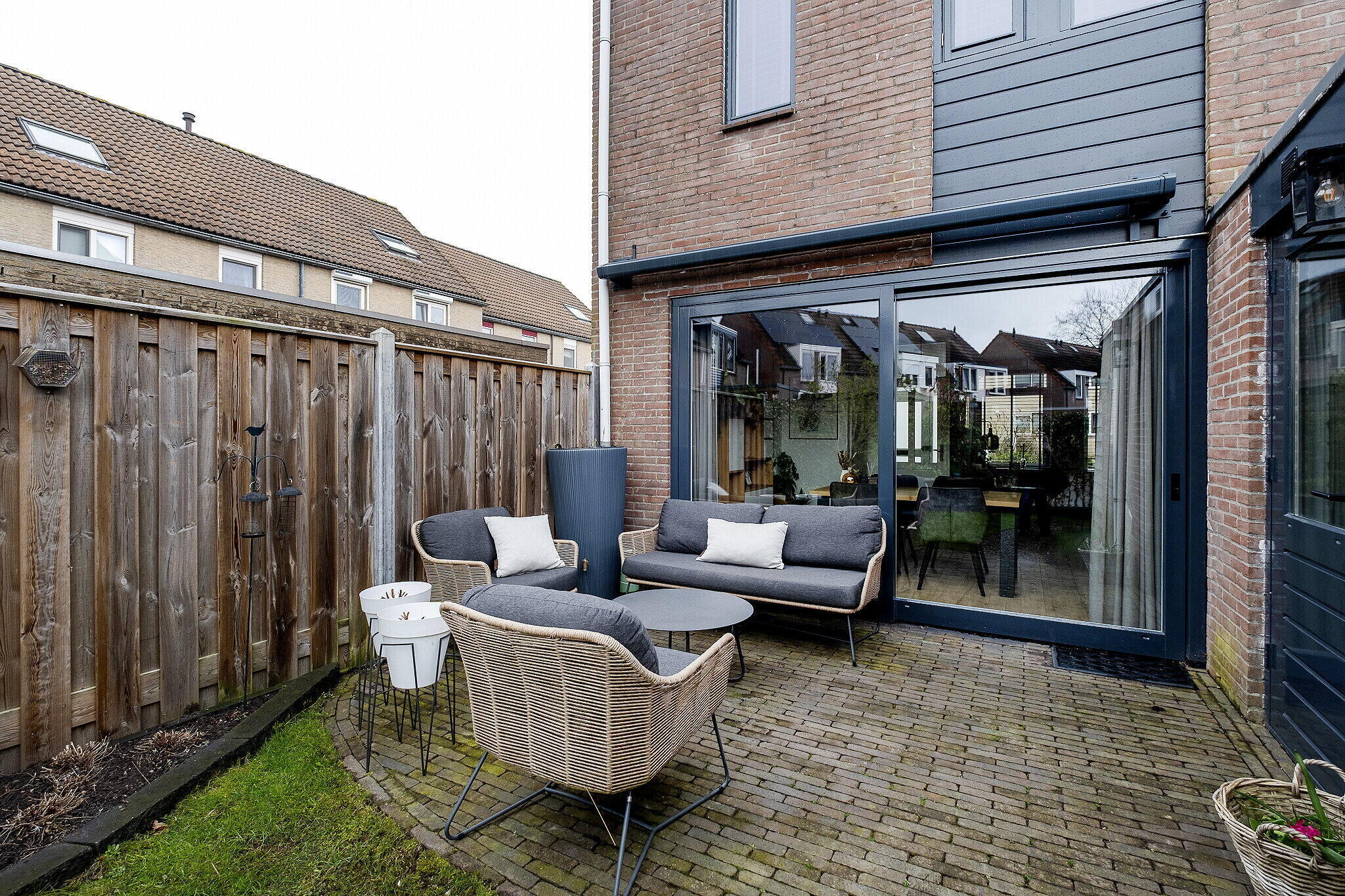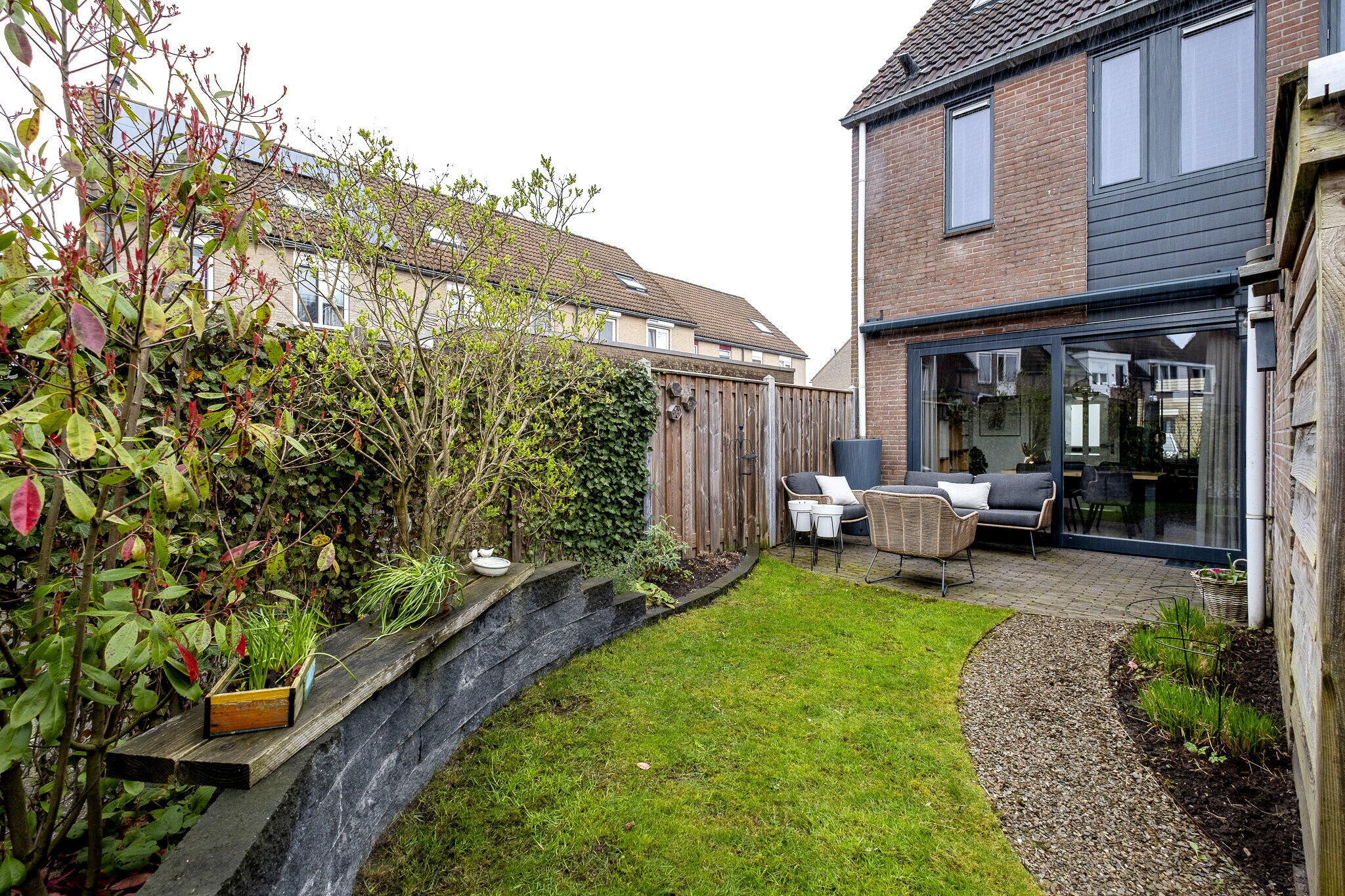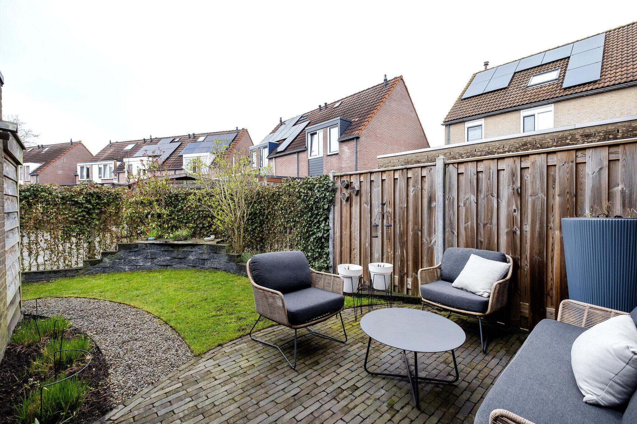 De besloten achtertuin is gelegen op het westen en is bereikbaar vanuit de bijkeuken en via eigen achterom. De heerlijk groene tuin biedt volop privacy en is toch onderhoudsarm. Achter de woning bevindt zich een overkapping voor het plaatsen van fietsen.