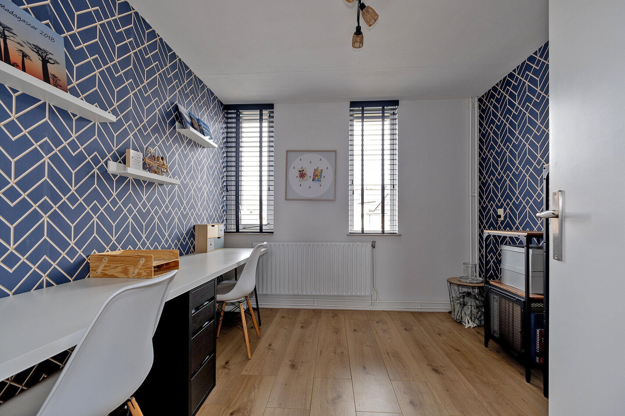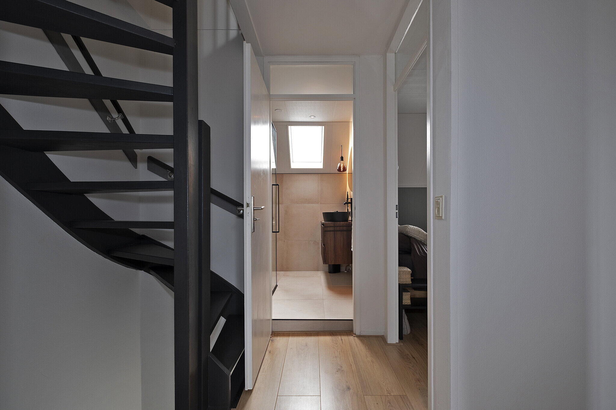 Overloop met toegang tot drie slaapkamers (ca. 9 m², 11 m² en 11 m²) en de badkamer (vernieuwd in 2025). De moderne badkamer is voorzien van een douche, wastafelmeubel, toilet en vloerverwarming.